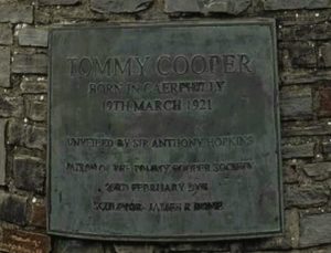 Cette sculpture en bronze du comédien Tommy Cooper, originaire de Caerphilly, mesure 2,7 m de haut et repose sur un socle en pierre naturelle et en granit. Créée par le sculpteur James Done, ell