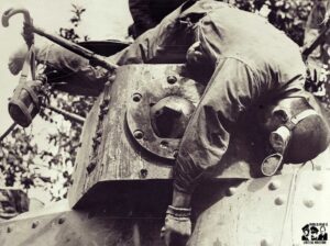 Le corps d’un tankiste japonais pend au-dessus de la tourelle de son Type 97 Chi Ha après la bataille de Luçon, 1945