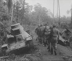 Sur cette photo, les hommes du 61e bataillon passent devant l’épave d’un char japonais Ha Go au village de Rabe, en octobre 1942.
