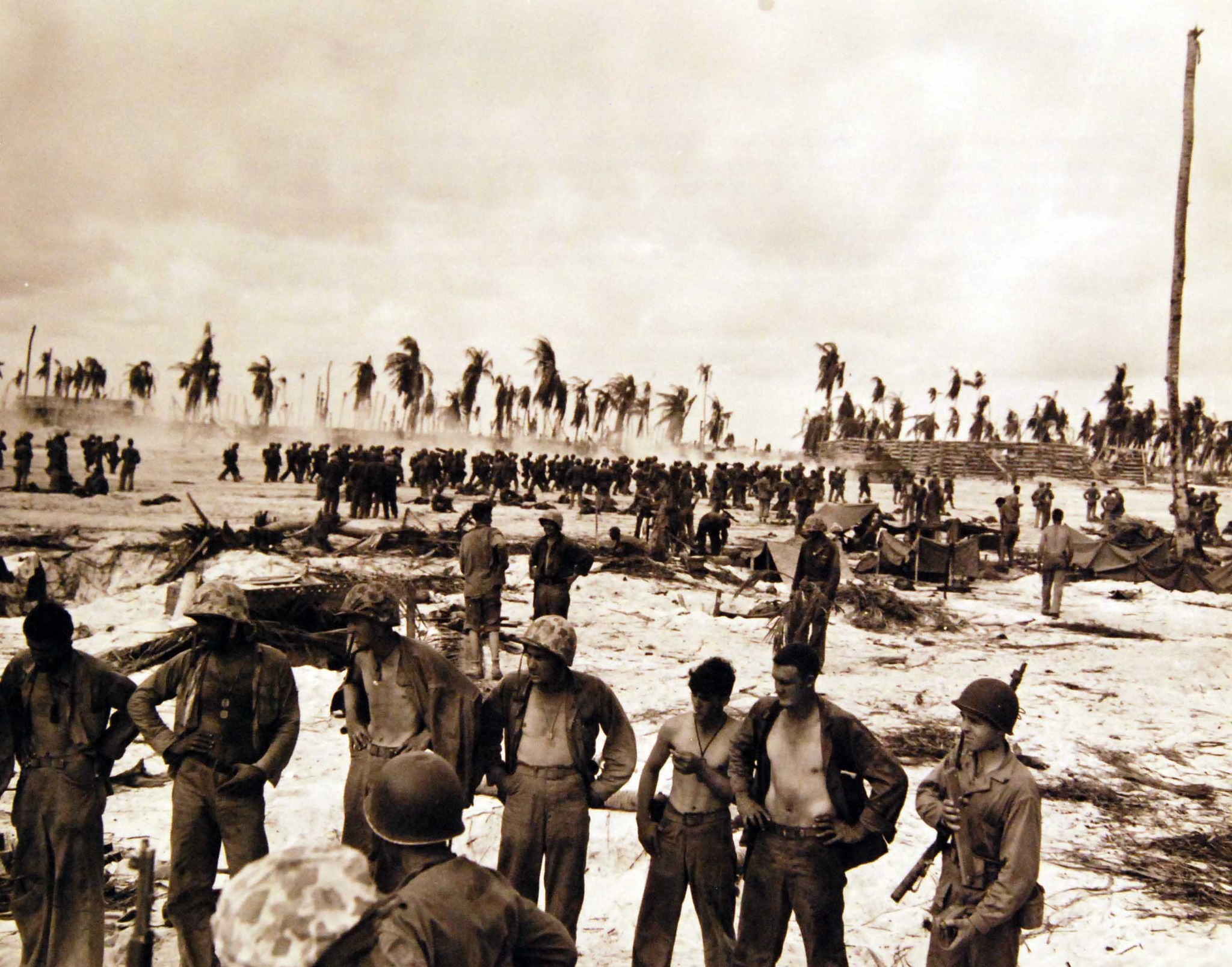 Bataille de Tarawa – Les Marines fatigués se préparent à évacuer vers les transports en attente.