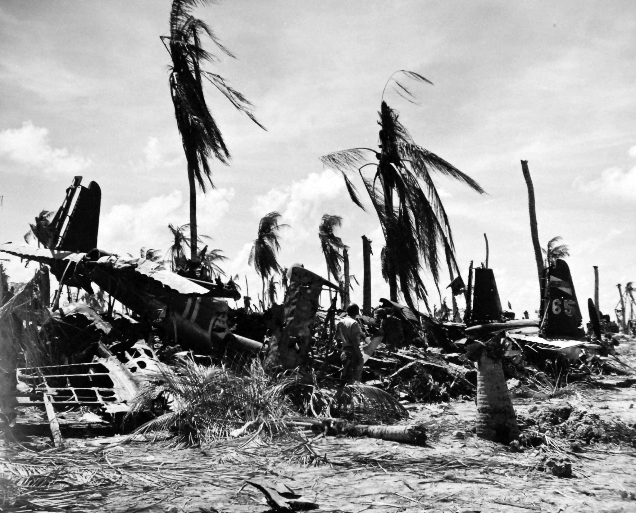 Operation Galvanic, novembre 1943. Avion japonais écrasé sur la piste d’atterrissage le 22 novembre 1943.