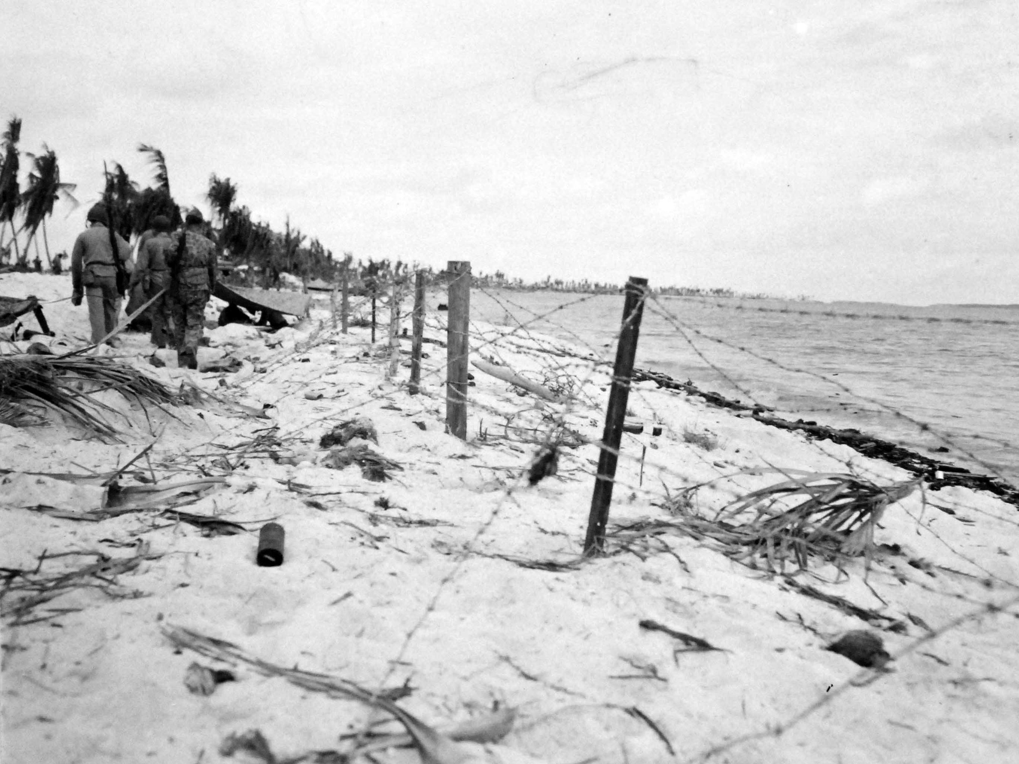Opération Galvanic, novembre 1943. Barricades défensives de fils de fer barbelé à Tarawa, South Beach, 22 novembre 1943.