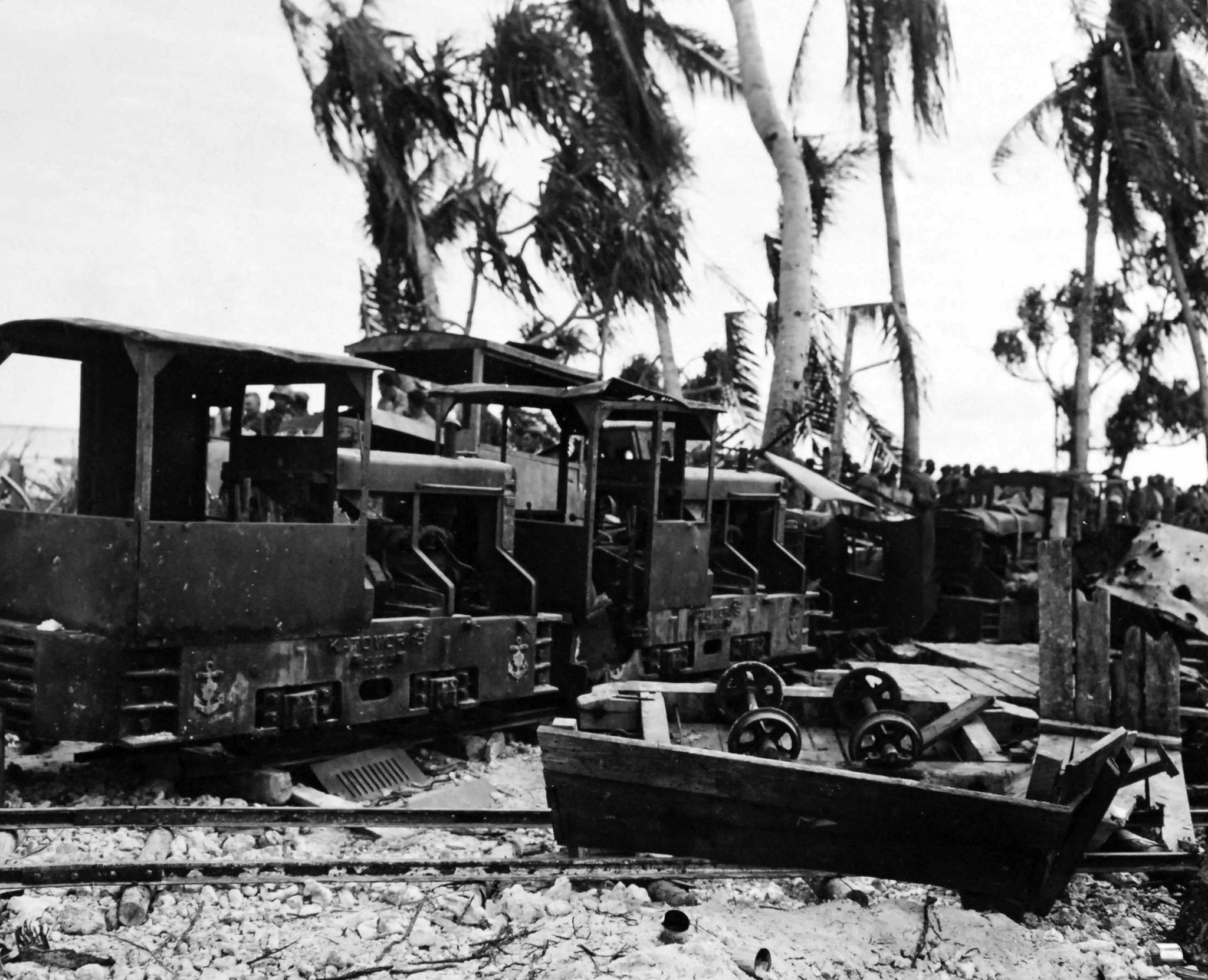 Opération Galvanic, novembre 1943. Des moteurs pour les chemins de fer japonais ont été utilisés pour transporter du corail depuis le récif vers la piste d’atterrissage, le 22 novembre.