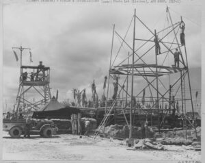 Tour de contrôle en construction sur Betio, île Tarawa, dans le groupe de l’île Gilbert. L’ancienne tour de contrôle est en arrière plan. 19 janvier 1944