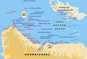 La carte montre l’emplacement approximatif des navires coulés au large de Guadalcanal.