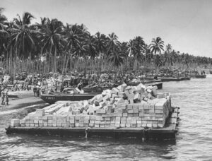 Des renforts de l’armée américaine nouvellement arrivés traversent la lagune de Lunga, décembre 1942-janvier 1943