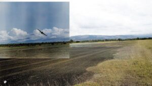 B-17 au-dessus de Henderson Field. Le Mont Austen en arrière-plan
