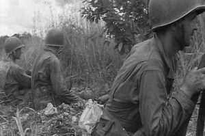 Les soldats de la 25e division d’infanterie se dirigeent vers leurs positions d’attaque pour le 10 janvier 1943. La plus grande attaque des États-Unis sur Guadalcanal.1