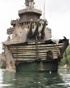 L’USS Minneapolis (CA-36), gravement endommagé après avoir perdu son arc lors de la brutale action nocturne à la bataille de Tassafaronga.