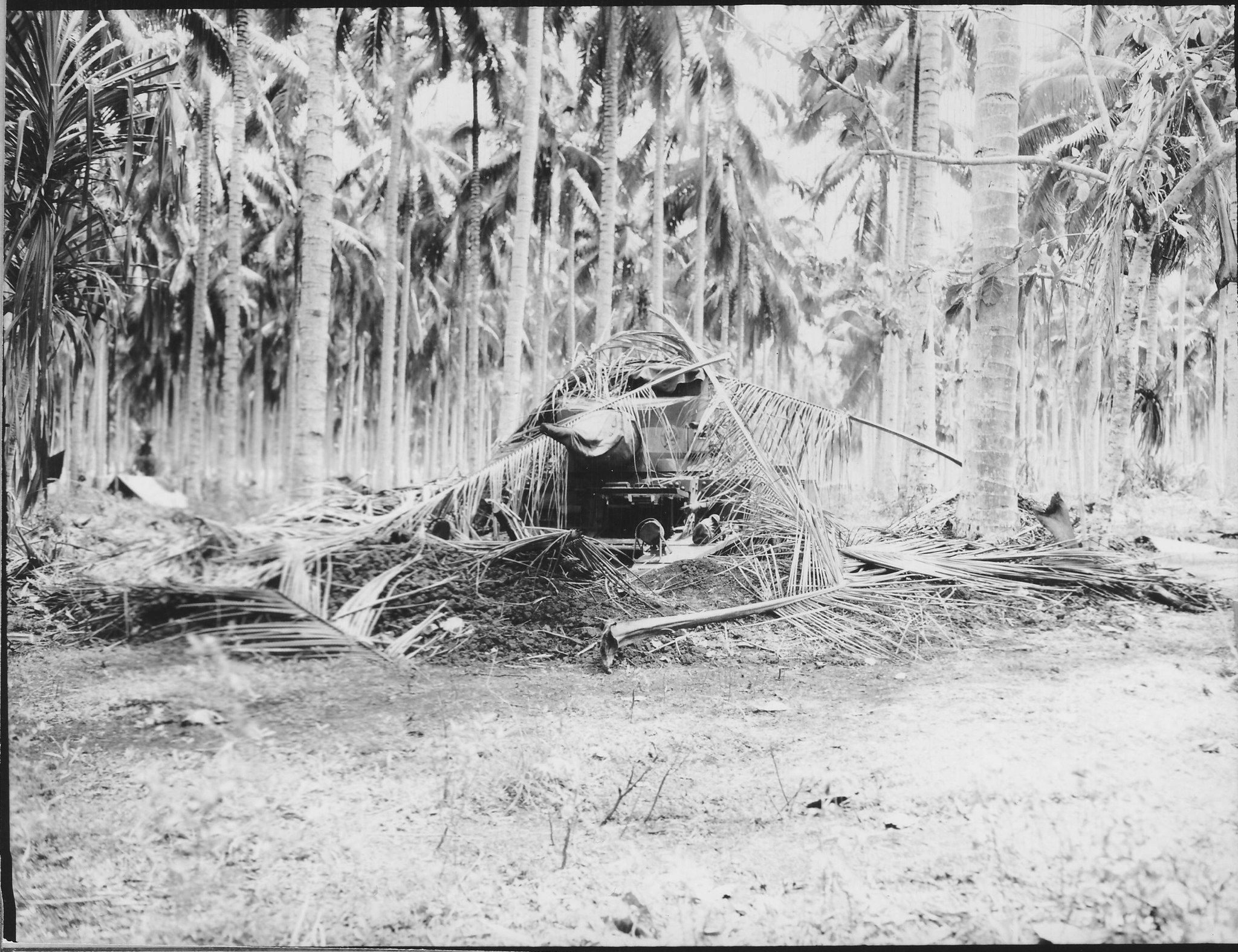 Un char léger Stuart dans une position défensive camouflée sur la plage, Lunga Point, décembre 1942.