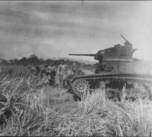 Un équipage de chars du 9e bataillon de défense marine court vers leur char – Guadalcanal, juillet 1943.