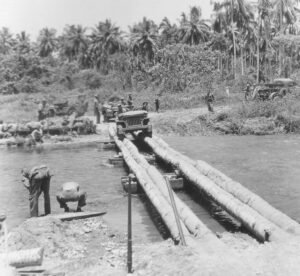 Un pont de fortune sur la rivière Bonegi, février 1943.