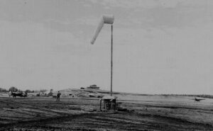Une belle photo de l’aérodrome de Henderson Field, du centre d’opérations aériennes « Pagoda » et de la manche à air de l’aérodrome.