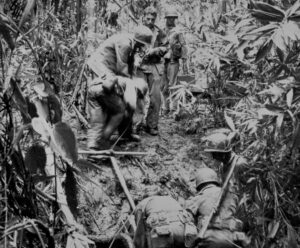 Une équipe de mortier de 81 mm du 3e Bataillon, 5e Marines (3-5) négocie un remblai glissant près de la rivière Matanikau, 1er novembre 1942.