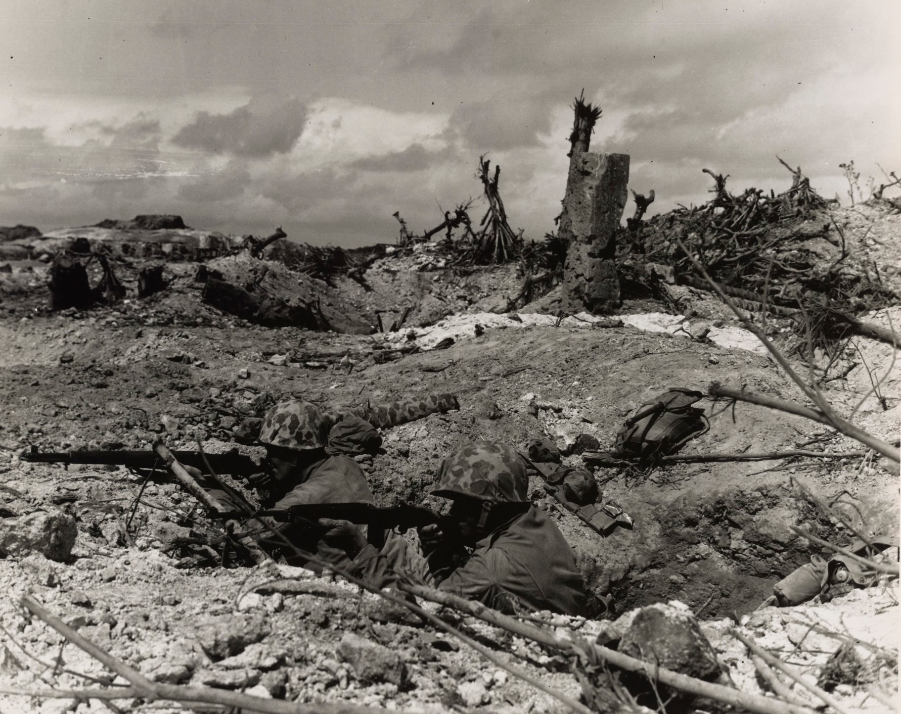 Deux Marines dans un trou creusé à la hâte dans de la roche sulfureuse se tiennent prêts à repousser