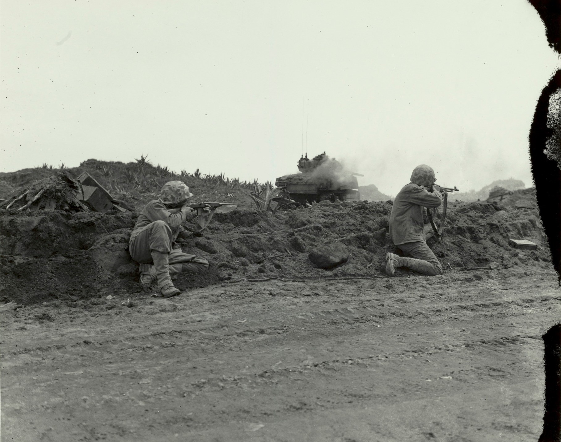 Les Marines tirent sur les positions japonaises derrière le char M-4 en feu sur les lignes de front lors de l’assaut sur la ville de Hishi.