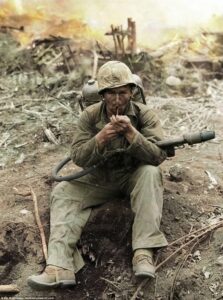 Un Marine américain avec un lance-flammes M2-2, allume un tuyau tandis que des litres d’essence et d’azote sont attachés à son dos. Iwo Jima, 1945.