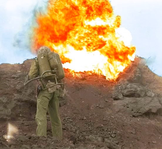 Un opérateur américain de lance-flammes M2, de la 5e Division de Marines, détruit une casemate japonaise camouflée sur Iwo Jima en février 1945