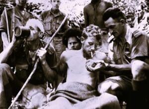 La photographie prise sur la piste de Kokoda le 22 septembre 1942 est celle d’un soldat australien blessé en train d’allumer sa cigarette par l’aumônier de l’Armée du Salut Albert Moore, 2-14e Bataillon.