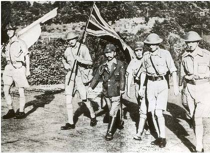 Le lieutenant-général Arthur Percival avec son groupe escorté par le colonel Ichiji Sugita IJA, en route vers l’usine Ford au pied de la colline Bukit Timah pour signer les documents de reddition inconditionnelle, Singapour, 15 février 1942.