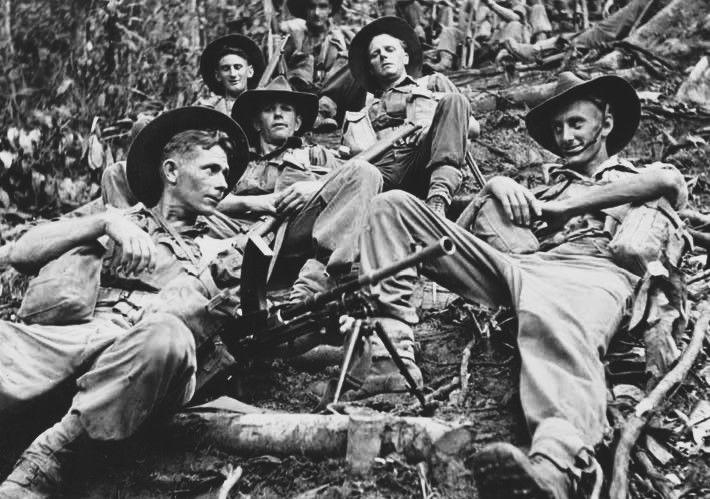 Les soldats australiens appartenant au 21e Bataillon de la 6e Division australienne se reposent après avoir marché le long de la piste Kokoda en Nouvelle-Guinée d’octobre à novembre 1942