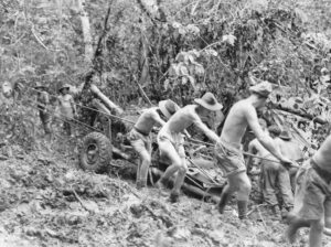 Les soldats australiens de la troupe B, 14e régiment de campagne, Royal Australian Artillery, sortent un canon de 25 pdr dans la jungle dense près d’Uberi, sur la piste Kokoda