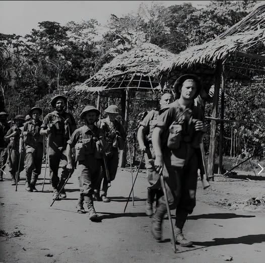 Octobre 1942 – Les hommes du 2-33e bataillon d’infanterie australien marchent à travers le petit village de Nauro en route vers Kokoda par les chaînes Owen Stanley