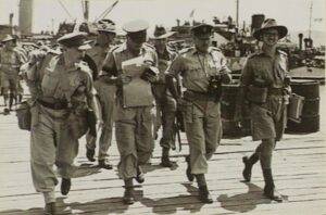 Officiers d’état-major sur le quai à Port Moresby après le débarquement de la 25ème brigade.