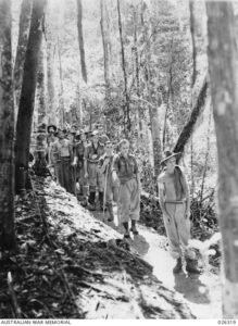 Papouasie – août 1942. Des membres blessés du 39e bataillon d’infanterie rentrant le long d’une piste de la jungle jusqu’à l’hôpital de la base.