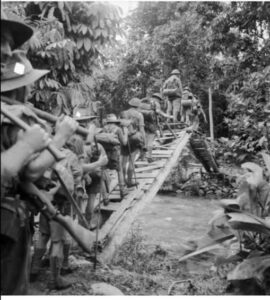 Wairopi, Nouvelle-Guinée. 1er décembre 1942-Les troupes australiennes traversent l’un des nombreux ruisseaux sur le chemin de Wairopi qu’elles ont capturé le 11 novembre 1942.