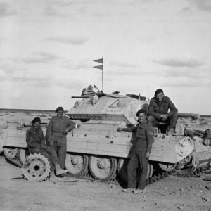 Un char Crusader est photographié avec son équipage britannique en Libye en 1941