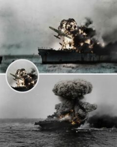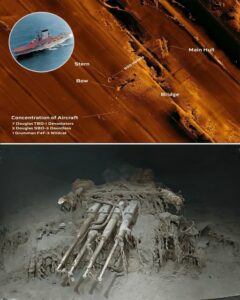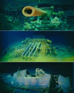 Explosion massive sur l’USS Lexington (CV-2) — Bataille de la mer de Corail, 8 mai 1942. L’USS Lexington repose aujourd’hui dans la mer de Corail, à environ 9 800 pieds de profondeur. Son épave est dispersée sur le fond en plusieurs grandes sections. La coque principale est dressée et s’étend sur environ quatre cents pieds, séparée le long de l’axe médian ; le côté tribord étant installé sur le plancher et le côté bâbord ouvert. Sa poupe est debout, et le pont repose entre les principales pièces comme un bloc détaché. Les dégâts sur toutes les sections montrent une défaillance structurelle profonde, due aux explosions internes et à l’effondrement qui a suivi. L’eau froide et profonde a ralenti la corrosion, de sorte que les avions, les positions des canons et les grandes jonctions restent faciles à identifier. De nombreuses structures (dont l’avion et les canons) sont encore clairement visibles, parce que la corrosion progresse lentement dans l’eau froide. L’USS Lexington Le « Lady Lex » a coulé le 8 mai 1942, lors de la bataille de la mer de Corail, après que des torpilles et des bombes l’ont paralysé et déclenché des incendies alimentés par les vapeurs de combustible. Les équipes de lutte incendies ont combattu les flammes pendant des heures, jusque dans l’après-midi où une explosion interne majeure a rendu la superstructure irrécupérable. L’équipage a abandonné le porte-avions en flammes au coucher du soleil. Pour empêcher sa capture, le destroyer USS Phelps l’a torpillé et sabordé. Le Lexington a sombré un peu avant huit heures du soir. Environ 216 hommes périrent dans le naufrage. Plus de 2700 furent sauvés au cours de l’une des plus grandes opérations d’évacuation de porte-avions du début de la guerre du Pacifique. L’USS Lexington CV-2 (« Lady Lex ») a emporté avec lui 35 avions dans les abîmes de la mer de Corail. Beaucoup étaient garés et armés sur le hangar et le pont d’envol lorsque les incendies se sont propagés. Le site de l’épave montre plusieurs avions encore près de la coque, dont des TBD Devastators et un Wildcat F4F, avec les ailes repliées. Ils sont allongés à environ 3000 mètres de profondeur et reposent dans l’eau froide et sombre. Ce naufrage a été une défaite majeure pour la marine américaine ; mais la bataille a stoppé un déplacement planifié des Japonais vers Port Moresby, et a montré comment les porte-avions pouvaient décider d’une campagne, même lorsque les deux flottes ne se voyaient pas.