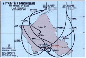 Le 7 décembre 1941, le Japon lança une attaque aérienne pour anéantir la flotte du pacifique américaine basée à Pearl Harbor, dans l’archipel d’Hawaï. La flotte cuirassée américaine fut largement détruite, ce qui contraignit les États-Unis à déclarer la guerre au Japon.
