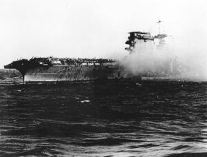 Un destroyer arrive aux côtés de l’USS Lexington (CV-2) alors que le porte-avions est abandonné dans l’après-midi du 8 mai 1942.