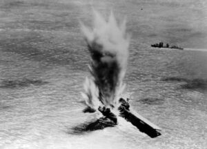 La bataille de la mer de Corail (qui se déroula dans le Pacifique, du 4 au 8 mai 1942) fut une bataille navale majeure qui opposa la Marine impériale japonaise (MIJ) aux forces navales et aériennes des États-Unis, et de l’Australie. Cette bataille fut la première où les flottes adverses ne se virent, ni ne tirèrent dessus, s’attaquant à distance depuis des porte-avions. Elle fut également le premier affrontement militaire de l’Histoire entre porte-avions. Le porte-avions américain USS Lexington explose le 8 mai 1942, plusieurs heures après avoir été touché par une attaque aérienne japonaise