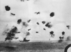 Le Hiryu manœuvre pour éviter les bombes des B-17 américains. Aucune n’atteindra son but.