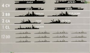 Les forces japonaises engagées dans la bataille de Midway sont composées de 4 porte-avions (l’Akagi, le Kaga, le Soryu, l’Hiryu), 2 cuirassés, 2 croiseurs lourds, 1 croiseur léger, 8 destroyers, environ 10 navires de soutien, 248 avions embarqués, et 16 hydravions.