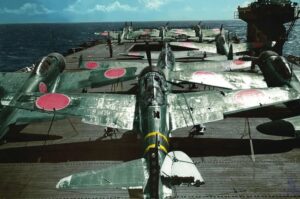 D’autre part, du fait de l’activité permanente sur le pont durant l’heure précédente (en rapport aux lancements et aux atterrissages des avions chargés de la protection aérienne), les Japonais n’ont jamais eu la possibilité de mettre en place le lancement de leurs appareils de réserve. Une pareille manœuvre demande au moins 30 minutes de plus.