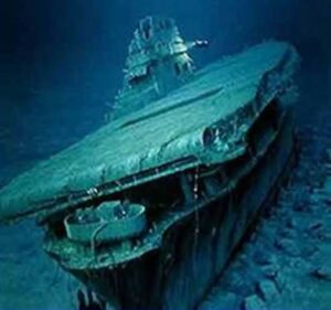 USS Yorktown L’ « USS Yorktown » (CV-5) était un porte-avions de l’« US Navy » qui joua un rôle clé dans les premières batailles dans le Pacifique, notamment la bataille de la mer de Corail et la bataille de Midway. Les attaques successives des bombardiers et des avions lance-torpilles du porte-avions japonais le « Hiryu » eurent raison du « Yorktown ». Il fut abandonné dans l’après-midi du 4 juin. Deux jours plus tard, alors que des opérations de sauvetage étaient en cours sur le bâtiment qui flottait toujours, le sous-marin japonais I-168 coula l’USS Hammann et endommage le Yorktown, qui sombra finalement le 7 juin, à 7h01, peu après le lever du jour. L’USS Hammann (DD-412) et l’USS Yorktown (CV-5) torpillés par le sous-marin japonais I-168 dans l’après-midi du 6 juin 1942 En mai 1998, son épave fut découverte et photographiée par l’océanographe Robert D. Ballard à une profondeur d’environ 5000 mètres, à environ 1 600 kilomètres au nord-ouest d’Honolulu. L’équipe d’exploration utilisa un véhicule sous-marin sans pilote « ROV » (véhicule sous-marin téléopéré, en anglais : « remotely operated underwater vehicle ») de haute technologie pour cartographier et documenter l’état du navire. Les images montrent que la coque du navire est restée partiellement dans son état d’origine, avec son pont d’envol et sa tour de contrôle restés intacts. L’une des découvertes les plus intéressantes de l’expédition fut une voiture trouvée près de l’épave, comme on le voit sur l’image cerclée en rouge. La voiture est toujours reconnaissable, malgré les sédiments marins qui l’ont recouverte pendant plus de huit décennies. Dans la bataille, l’USS Yorktown a perdu plus de 140 membres de son équipage. Le gouvernement des États-Unis déclara que le site de l’épave recevrait les honneurs comme une tombe marine pour les marins tombés.