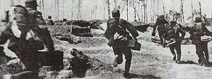 Troupes japonaises entrant dans Qiqihar le 19 novembre 1931. Pendant l’entre-deux-guerres, ce qui n’était qu’une force de garnison se transforma en un groupe d’armées pour soutenir les intérêts japonais en Chine, en Mandchourie et en Mongolie. L’armée de Guandong fut en grande partie responsable de l’établissement de l’État fantoche japonais du Mandchoukouo. Elle y joua un rôle de première importance pendant la deuxième guerre sino-japonaise, de 1937 à 1945.