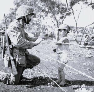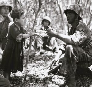 Un geste simple, une douceur au cœur d’une guerre totale Une douceur derrière les barbelés – Le sergent Federico Claveria à Tinian, août 1944 Le sergent Federico Claveria à Tinian, août 1944 Août 1944, île de Tinian, dans l’archipel des Mariannes. Un photographe du 5th « Amphibious Corps » des Marines américains, le Sergent Federico Claveria, s’arrête quelques instants et s’agenouille devant une clôture de barbelés. De l’autre côté, une petite fille japonaise, prisonnière civile, tend timidement la main. Dans un geste d’humanité aussi rare que précieux, Claveria lui tend une sucrerie. Le contraste est surprenant entre l’atrocité du conflit et la tendresse fragile d’un instant partagé entre deux mondes que tout oppose. La bataille de Tinian : l’assaut foudroyant sur une île stratégique du Pacifique Du 24 juillet au 1er août 1944, les Marines de la 2ème et 4ème division débarquent sur Tinian, un îlot d’à peine 100 km², distant seulement de 5,6 km au sud-ouest de Saipan. Tinian est alors un objectif clé pour l’aviation américaine, car sa topographie plane le rend idéal pour construire d’immenses pistes d’aviation, capables d’accueillir les bombardiers « B-29 Superfortress ». La bataille est courte, mais intense. Comme à Saipan, les forces japonaises emploient des tactiques de guérilla : retraits diurnes, assauts nocturnes, attaques-suicides, combats à l’arme blanche. Mais sur Tinian, les Américains disposent d’un avantage tactique : le terrain permet l’usage efficace des blindés et de l’artillerie lourde. En neuf jours, l’île est entièrement conquise. Le calvaire des civils japonais Une fois les combats terminés, les Marines découvrent des milliers de civils japonais, souvent tapis dans des grottes ou des abris insalubres improvisés. 13 000 personnes sont internées pour des raisons de sécurité. Mais la victoire des Marines est aussi un terrible drame humain : environ 4 000 civils meurent, victimes de suicides collectifs, de liquidations sommaires ordonnées par leurs officiers, ou tués accidentellement lors des combats. C’est dans ce contexte qu’intervient la scène capturée sur la photo. Un simple bonbon, donné à travers une barrière, devient un acte de réconciliation silencieuse, une trace d’humanité au milieu des cendres. Derrière l’objectif, un cœur de soldat… Le Sergent Claveria n’est pas un soldat ordinaire. Il est photographe de guerre, formé pour capturer la réalité du front, les combats, les visages, les morts. Mais ce jour-là, il fait plus qu’observer : il tend la main. Son geste ne changera pas le cours de la guerre, mais il témoigne d’une dignité préservée, d’un regard qui voit au-delà de l’uniforme ou des barbelés. La férocité des combats vue à hauteur d’enfant Le sergent de marine Charles Monges donne une tasse d’eau à une petite fille japonaise qui a erré hors des bois sur Tinian, août 1944 ! La bataille de Tinian fut une empreinte stratégique dans la guerre du Pacifique. Elle permettra bientôt aux B29 de bombarder le Japon continental. Mais cette photo, elle, raconte une autre histoire : celle d’un instant de paix en suspension, volé à la guerre, d’un Marine qui choisit d’offrir un bonbon à une fillette ennemie plutôt que de l’ignorer. Et dans cette fraction de seconde, c’est l’espoir d’un monde moins cruel qui s’invite entre les barbelés, les ruines et les morts…