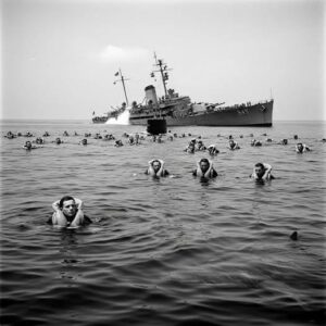 USS Indianapolis 10 juillet 1945 L’USS Indianapolis (CA-35) était un croiseur lourd de classe « Portland » appartenant à l’ « United States Navy ». Il fut célèbre pour les circonstances de son naufrage, qui reste à ce jour le plus meurtrier de l’histoire de la marine militaire américaine. Lancé en 1931, l’Indianapolis intégra la « Scouting Force » (dans les années 1920 et 1930, l’une des deux flottes avec l’ « Asiatic Fleet », de l’ « United States Navy ». Elle fut rebaptisée « Scouting Force en 1931 »). En 1933, l’USS Indianapolis participa avec succès à de nombreuses campagnes de la guerre du Pacifique. LE TORPILLAGE ET LE NAUFRAGE… Le 30 juillet 1945 (soit quatre jours après avoir livré à la base aérienne américaine de Tinian des composants importants des deux bombes atomiques, « Little Boy » et « Fat Man », qui seront lancées respectivement sur Hiroshima et Nagasaki), le navire, qui naviguait en mer des Philippines, fut torpillé par le sous-marin I-58 de la Marine impériale japonaise. Il coula en douze minutes, emportant avec lui environ 300 des 1 195 membres d’équipage. USS Indianapolis coulé par le sous-marin japonais I-58 le 30 juillet 1945 Les 900 survivants durent alors affronter l’hypothermie, la déshydratation et des attaques de requins alors qu’ils attendaient de l’aide sur des embarcations de sauvetage. Quatre jours plus tard, ils seront repérés par l’équipage d’un bombardier, « Lockheed Ventura », en patrouille de routine ; seuls 317 marins survivront à ce naufrage.