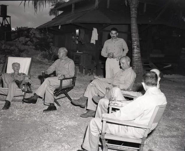 De gauche à droite – Ernie Pyle (correspondant de guerre), général major Graves B. Erskine, général commandant, 3e division de marine; Capitaine Raymond Henri, officier des relations publiques, 3e division de marine; Lt. Commandant Max Miller