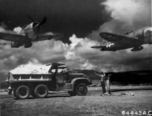 Le P-47 Thunderbolts du 318th Fighter Group décollage de East Field sur Saipan, îles Marianas en octobre 1944