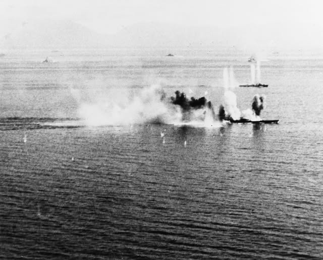 Bataille du Golfe de Leyte – Le cuirassé japonais Musashi sous une lourde attaque lors de la bataille de la mer de Sibuyan, le 24 octobre 1944.
