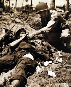 Bataille du Golfe de Leyte – Le garde côtier aide un compagnon tombé sur la plage des Philippines