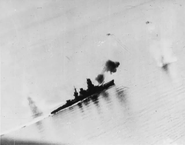 Le cuirassé japonais Nagato tire ses canons principaux lors de la bataille de la mer de Sibuyan, le 24 octobre 1944.…