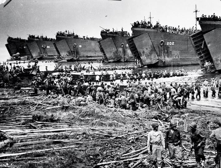 Les LST débarquent des troupes lors du débarquement de Leyte à White Beach, Leyte