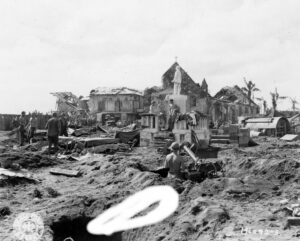 Les troupes d’invasion creusent des postes de mitrailleuses antiaériennes dans les ruines de Dulag, île de Leyte, P.I. le 22 octobre 1944.