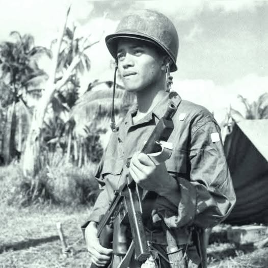 Un jeune combattant de guérilla philippin, armé d’une mitraillette M1A1 Thompson, fier de sa nouvelle tenue. Leyte, novembre 1944.